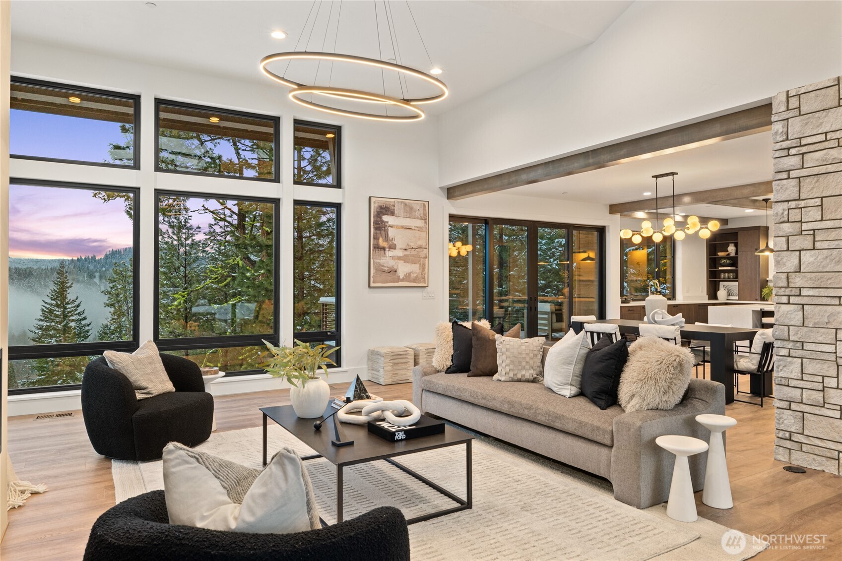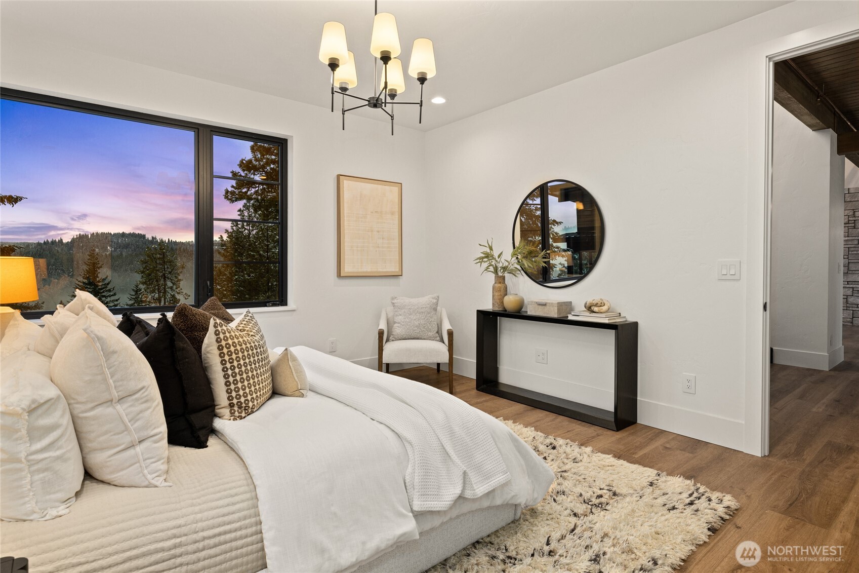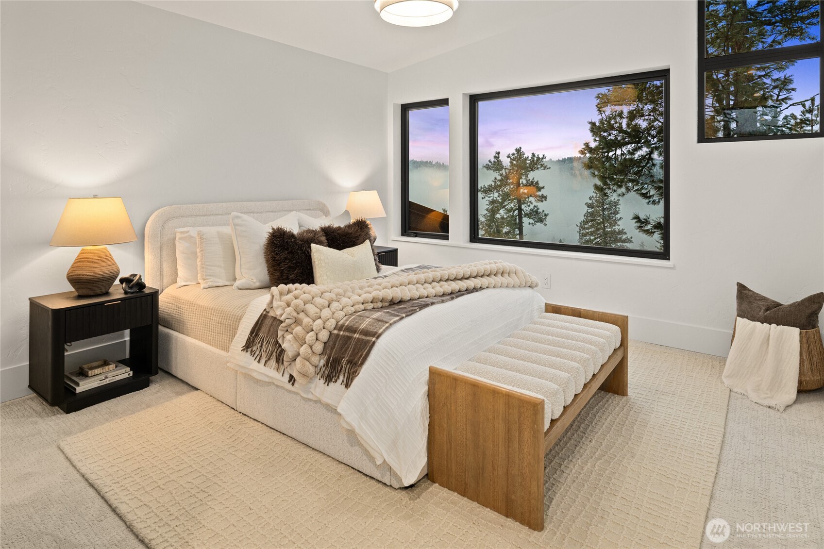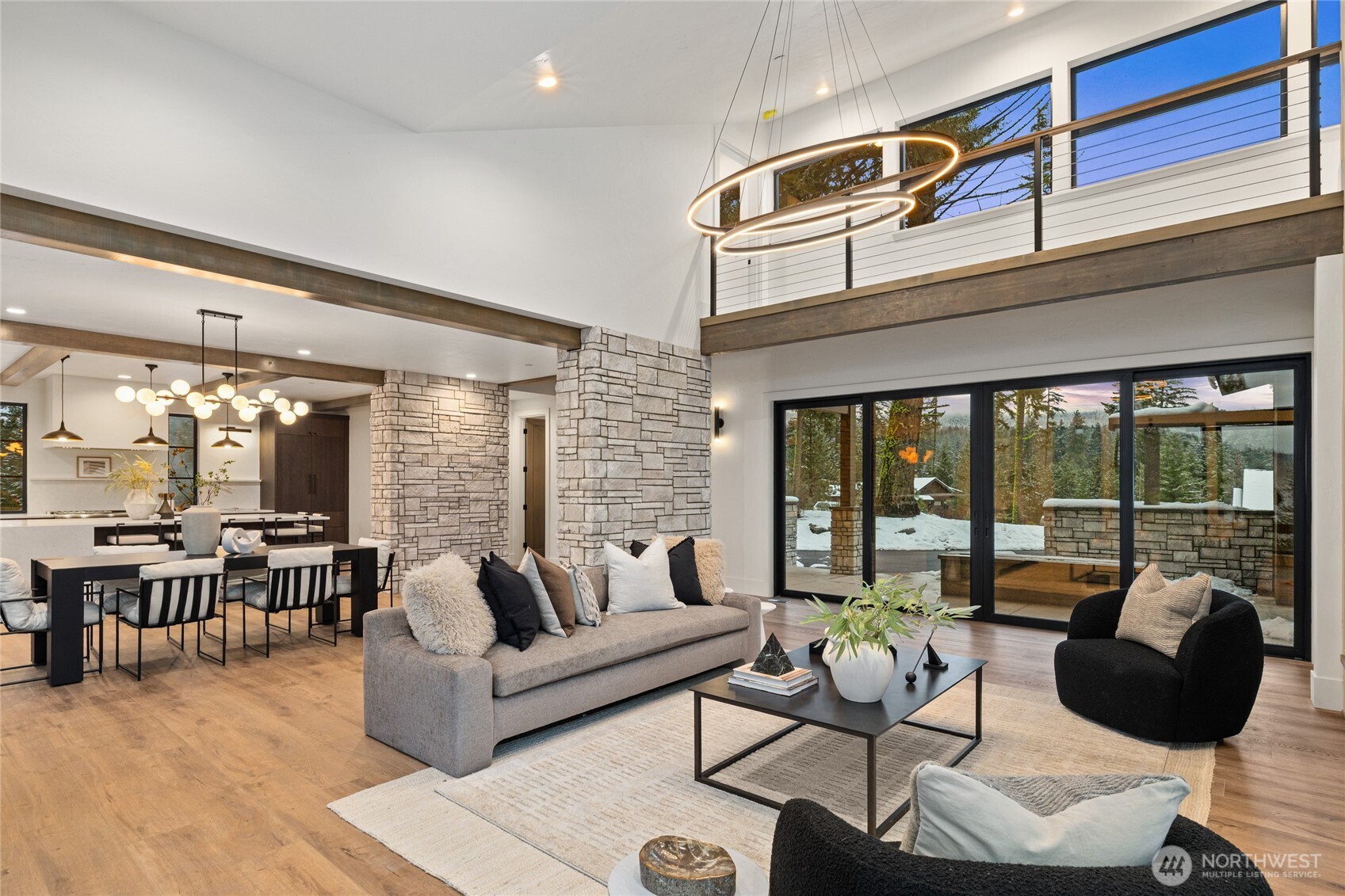 Situated on one of the best view sites in Suncadia, this stunning new modern mountain home by Benchmark Custom Homes offers panoramic views in the gated River Ridge neighborhood. This 5-bedroom + den home includes a separate lower-level living room, high-end kitchen with walk-in pantry, main-level ensuite, upstairs primary & guest bedrooms, and a lower-level bonus with more bedrooms. Radiant heated floors in the basement and main living room. Enjoy custom tile, flooring, steel staircase & more. Entertain on the elevated deck or ground-level patio with direct trail access to the river or Nelson Farm Pool.