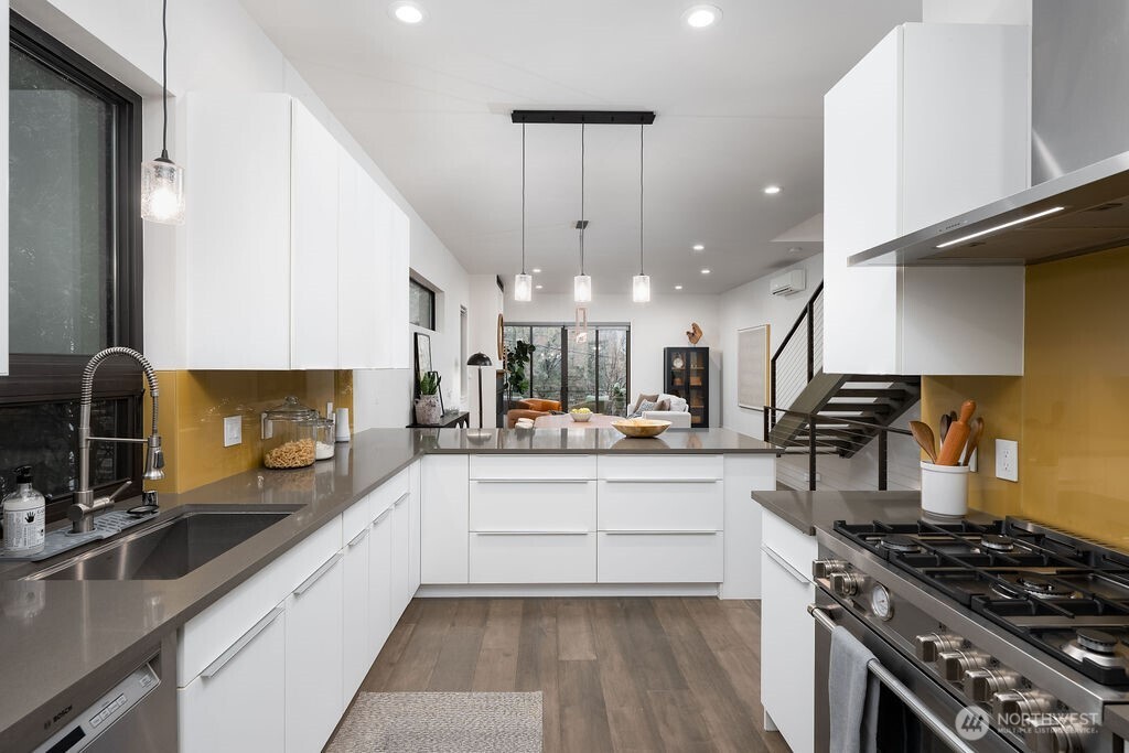Welcome to fun, fresh Fremont, Seattle's own time capsule of culture, "The Center of The Universe". World-Class dining and vibrant street art, fantastic parades, the Zoo, live music & the Fremont Cut Tech hub a few blocks away. Awesome rooftop with sweeping Seattle City views, Great curb appeal with custom wood exterior & feature lighting; Original lighting and custom features, 10 Ft ceilings, a sprawling living room centered on an architectural floating staircase; Luxurious, spa-like bathrooms, premium appliances, & a spectacular rooftop terrace in the trees with sweeping views of Seattle and Rainier. Private yard with covered deck. A full self-contained ADU on the main floor, (4th bedroom) A chic oasis in Seattle's vibyist neighborhood.